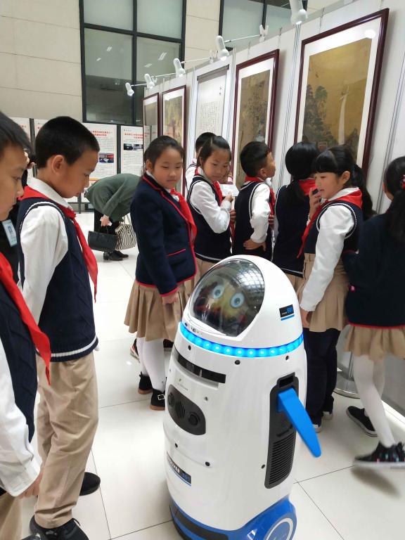 此次國畫藝術長廊展以歷史為軸,展出各時期的名家巨作,每幅作品下均配有二維碼,掃碼可聽主播精講。另外,畫展專門邀請重慶公圖網絡科技有限公司提供技術支持,定制了叮小胖智能機器人進行講解和互動,打造出不一樣的視聽鑒賞觀展環境。從22日開展以來,每天來參觀的師生絡繹不絕。23日中午,畫展迎來了大學城第三小學的60名小客人,這些五年級的孩子在叮小胖的帶領下領略了從戰國到明清各朝代的經典畫作,精美的構圖藝術,巧妙的色彩運用,有趣的創作故事都帶給同學們完美的鑒賞體驗。而3D版的《清明上河圖》則讓大家身臨其境感受了北宋都城的繁榮生活,同學們嘖嘖稱奇。與機器人叮小胖的互動更是讓此次參觀達到高潮,同學們爭著與小胖對話,他們一起聊天,一起講歷史知識,一起唱歌、跳舞,學生們真切感受到了科技與藝術的完美融合。