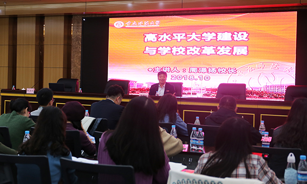 在與全體學員合影留念之后,周澤揚校長以“建設高水平大學和學校改革發展”為題,從三個方面作了首場專題報告。一是講述了重師波瀾壯闊、跌宕起伏的辦學歷程。周校長談到了學校從專科升為本科、學院更名為大學、獲得教育部本科教學評估優秀、大學城校區建設,以及成為博士學位授予單位等幾個關鍵節點,發自肺腑地感慨學校成績的來之不易,并特別感謝老一代重師人為學校今天的發展打下的家業和奠定的根基。二是成功更名為大學以后的辦學理念、辦學思路。周校長談到,隨著大學職能的三次轉變,學校積極融入國家、地方發展戰略。從“學科建設為龍頭,教學科研為兩翼”到提出“人才培養更有質量、教師產出更有水準、核心指標更有競爭”的內涵發展,再到2013年召開千人大會后實施“內涵發展、提檔升級戰略”,構建了師范教育和非師范教育“兩輪驅動”,普通基礎教育、職業教育和漢語國際教育“三駕馬車”,文化傳承與創新、決策咨詢與公共服務、科技攻關與應用轉化“三大版塊”協同發展的特色辦學格局。特別是,在不斷的發展、探索、實踐中,創新性提出了“兩個維度,四個層面”的辦學理念,以此作為檢驗辦學質量高低的標準和切入點。“兩個維度”,就是指“校內、校外”兩方面。“四個層面”,就是指“校內、校外”兩個維度各自包含的兩個層面,即“校內”維度,主要看學科專業發展狀況和學校文化建設狀況;“校外”維度,主要看學校參與服務地方經濟社會發展的廣度和深度、廣大校友的發展狀況以及對母校的感情深厚程度。三是如何推進建設高水平師范大學。周校長在分析了目前高等教育面臨的新形勢和新要求之后,著重圍繞“推進建設高水平師范大學”這一核心目標,提出高水平大學應該具有的“十大特征”:學科有實力、專業有名氣、學術有影響、隊伍有水平、育人有質量、開放有活力、服務有貢獻、文化有引領、辦學有特色、社會有地位,并從高水平大學的核心任務以及如何推進高水平師范大學建設四個方面進行了深入的分析說明。