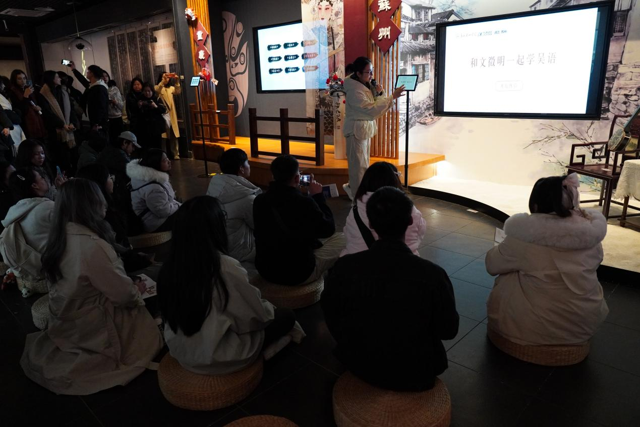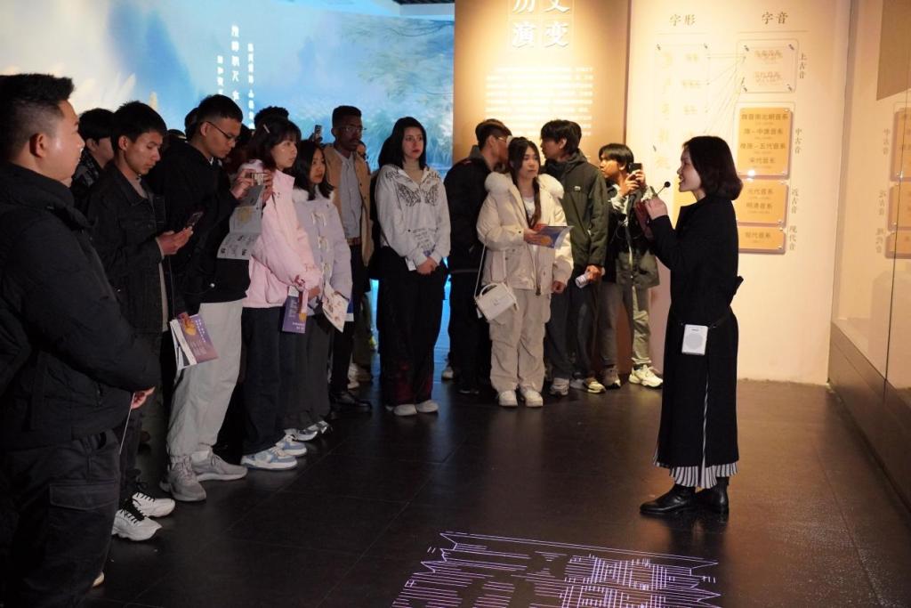 展覽設置漢字的歷史演變、研究傳播和藝術傳承三個單元,通過現代信息語音技術,帶領國際學生穿越時空,了解漢字傳播的歷史脈絡與成就、感受漢字字形與字音的變遷、體驗漢字的藝術韻味。采用古音構擬、方言語音具象化等形式,使傳統抽象的語言文化概念跨越界限,轉化為可視、可聽、可感、可觸的“實物”,全方位調動感官“聽見和看見漢字里的中國文化”。國際學生們興致盎然,積極參與,來自越南的梅蓮、斯里蘭卡的何含同學即興朗誦了《念奴嬌·赤壁懷古》,蘇丹的浩然同學演唱中文歌曲《今生緣》,哈薩克斯坦的杜拉提同學更用中文表達對本次活動的所學所感。