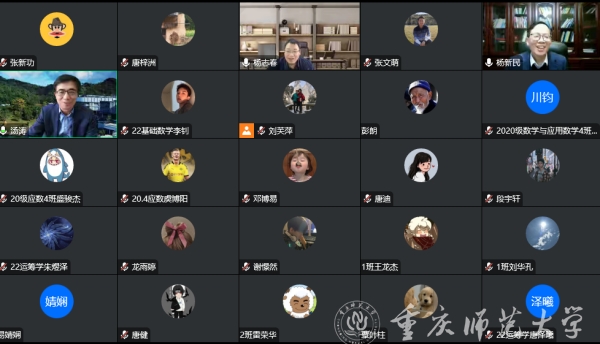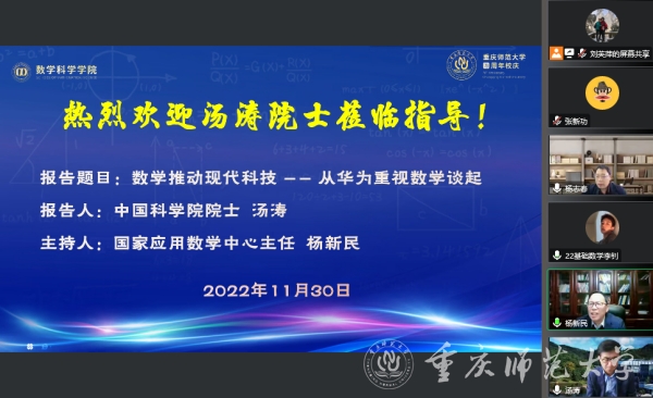11月30日下午,中國(guó)科學(xué)院院士、北京師范大學(xué)-香港浸會(huì)大學(xué)聯(lián)合國(guó)際學(xué)院校長(zhǎng)湯濤院士受邀為我校師生作題為《數(shù)學(xué)推動(dòng)現(xiàn)代科技-從華為重視數(shù)學(xué)談起》的線上學(xué)術(shù)講座,講座由數(shù)學(xué)學(xué)科帶頭人、重慶國(guó)家應(yīng)用數(shù)學(xué)中心主任楊新民教授主持,數(shù)學(xué)科學(xué)學(xué)院和國(guó)家應(yīng)用數(shù)學(xué)中心部分師生、以及市內(nèi)外相關(guān)專(zhuān)家學(xué)者300余人參加。