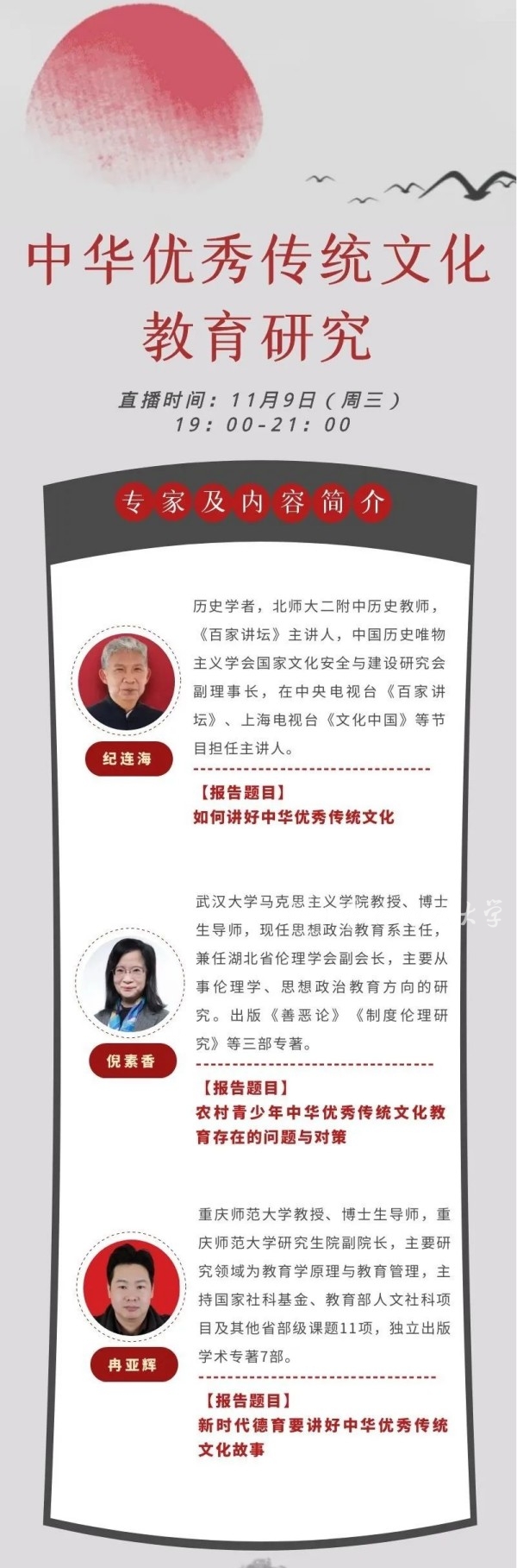 11月9日,以“中華優秀傳統文化教育研究”主題的“中國德育·明德講堂”第18正式開講,我校教育科學學院冉亞輝教授應邀作題為“新時代德育要講好中華傳統文化故事”的主題講座。“中國德育·明德講堂”系中國教育科學研究院《中國德育》雜志社主辦的系列學術講座,是國內德育領域具有重要影響力的學術論壇。