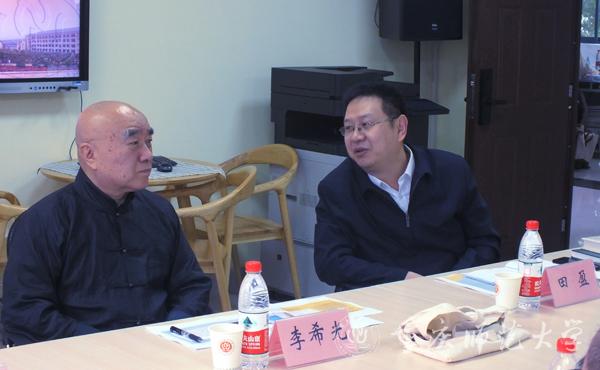 報告會前,我校副校長田盈教授來到學院與李希光教授進行了簡短座談,介紹了學校的歷史沿革和基本概況,對李希光教授來校講學表示熱烈歡迎。