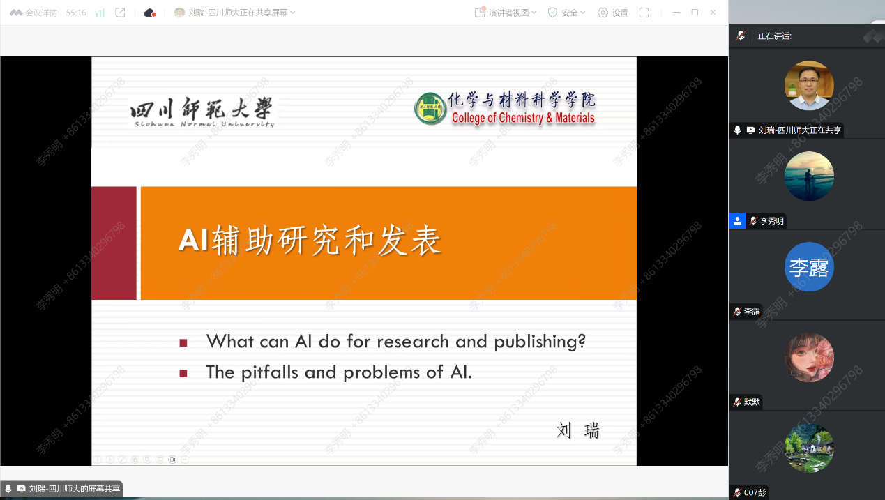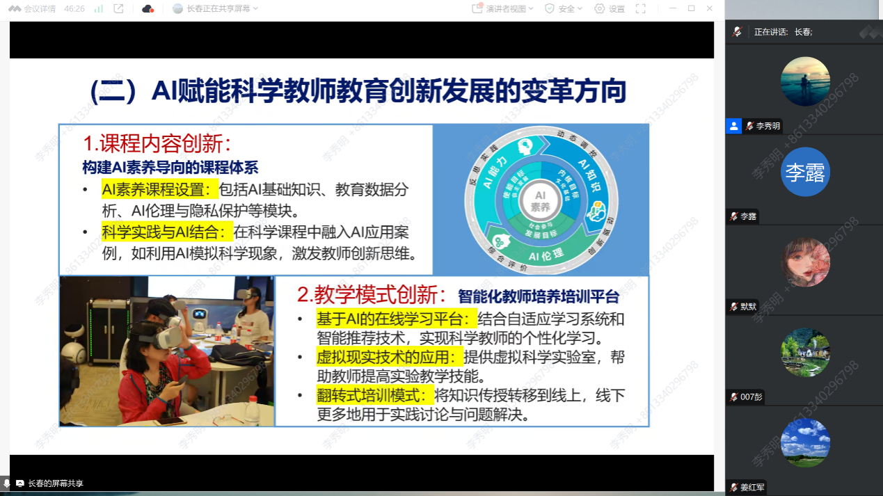 重慶市科學教育虛擬教研室、重慶市“十四五”重點學科科學教育學科、國家級一流本科科學教育專業建設點負責人林長春教授以“人工智能背景下科學教師教育創新發展”為題,從“人工智能賦能科學教師教育的背景”“當前科學教師教育面臨的機遇和挑戰”以及“人工智能賦能科學教師教育創新發展”等方面進行了報告分享。隨后,四川師范大學科學教育研究所所長劉瑞教授以“AI輔助研究與發表”為題,圍繞“AI能做什么”“如何向AI提問”“AI輔助研究發表中可能出現的問題”等方面進行了報告分享。隨后,與會專家圍繞人工智能與科學教師教育相關問題進行了深入討論交流。