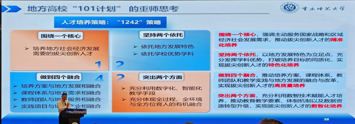 此外,王國(guó)胤還系統(tǒng)地梳理了新時(shí)代人才培養(yǎng)范式的演進(jìn)邏輯—從信息化邁向數(shù)字化,再步入“數(shù)智化”階段。他提出,應(yīng)構(gòu)建“師—生—機(jī)”三位一體的復(fù)合育人結(jié)構(gòu),利用生成式人工智能、虛擬人、教育機(jī)器人等智能代理,推動(dòng)教學(xué)從灌輸式向交互式、精準(zhǔn)化轉(zhuǎn)變。王國(guó)胤詳細(xì)介紹了我校在“1281”數(shù)字校園體系建設(shè)方面取得的階段性成果,強(qiáng)調(diào)數(shù)字校園不僅是可視化展示工具,更是服務(wù)全體師生的智慧化工作與學(xué)習(xí)空間。他結(jié)合學(xué)校黨代會(huì)提出的四大發(fā)展戰(zhàn)略,深入剖析了地方高校在交叉融合、數(shù)字賦能和特色發(fā)展中的路徑選擇,分享了“101計(jì)劃”,“1242策略”等改革試點(diǎn)實(shí)踐,充分展現(xiàn)我校在數(shù)智教育領(lǐng)域的理論引領(lǐng)力與實(shí)踐創(chuàng)新力。